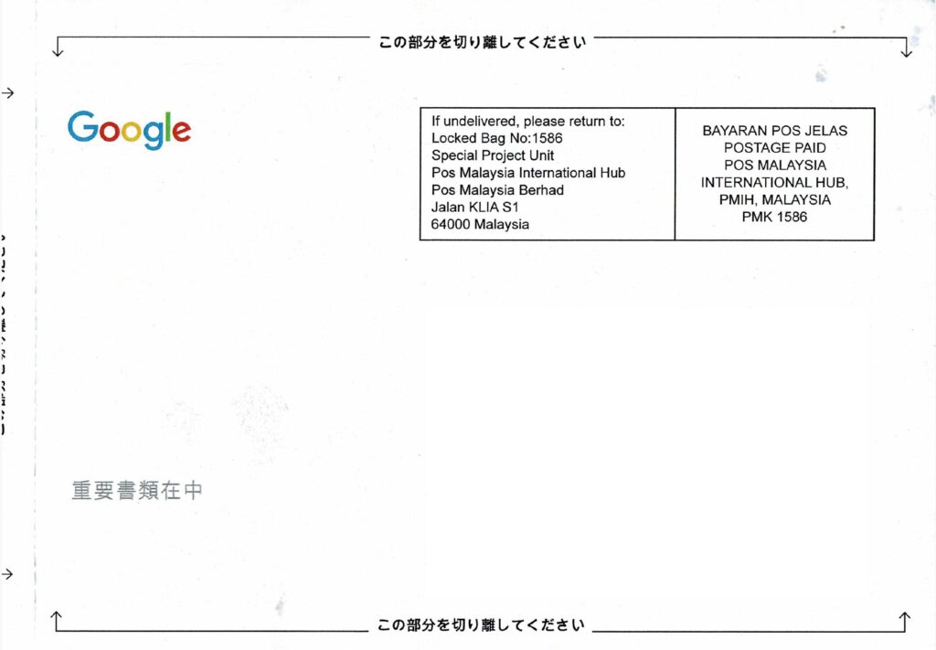 封筒のデザインは意外とシンプルで、「Google」ロゴが目印になっています。