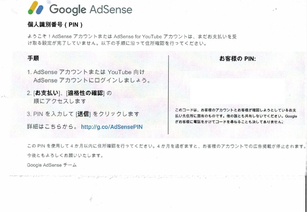 Google AdSenseでは、初回の本人確認としてPINコードが書かれた封筒が自宅に届きます。